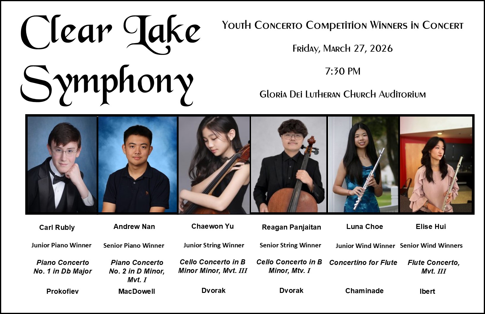 The Clear Lake Symphony held its annual Youth Concerto Competition on January 17, 2026 for young artists from Houston area high schools, junior highs, and elementary schools. The winners will be provided with a scholarship and the opportunity to perform with the Symphony at the March 27, 2026 concert. A total of fifty-eight (58) contestants participated in the 2026 competition.